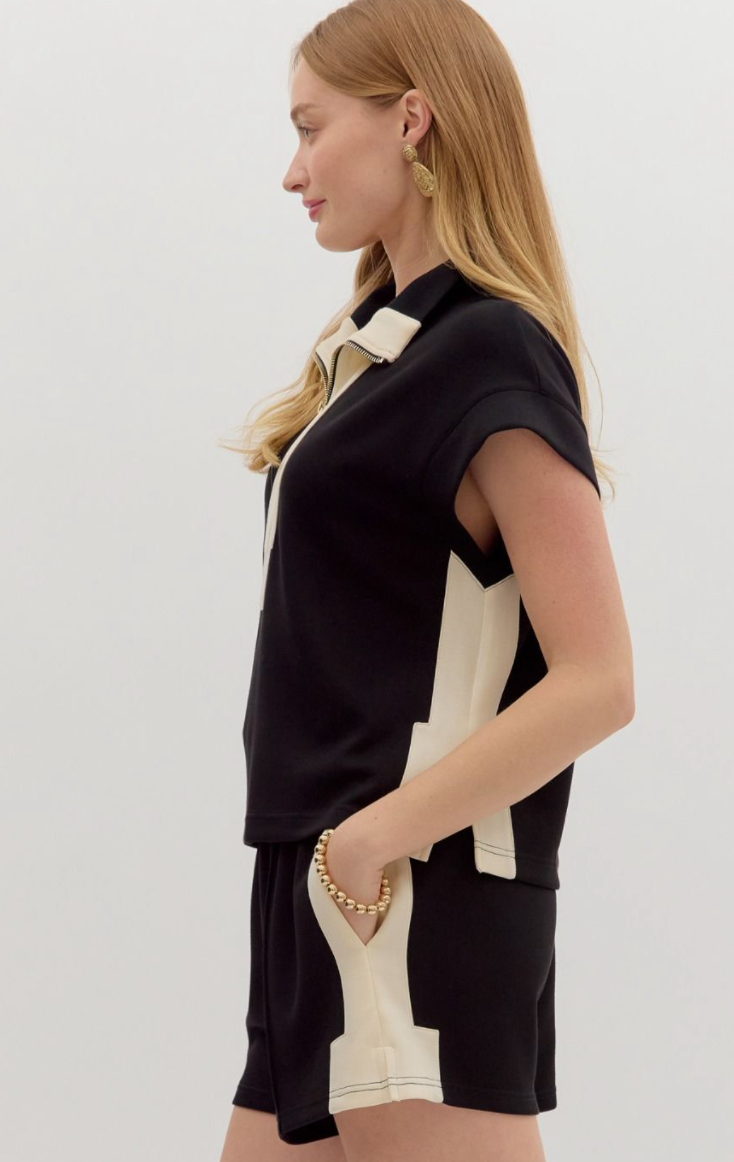 Zip-front top with bold contrast detailing, gold hardware zipper